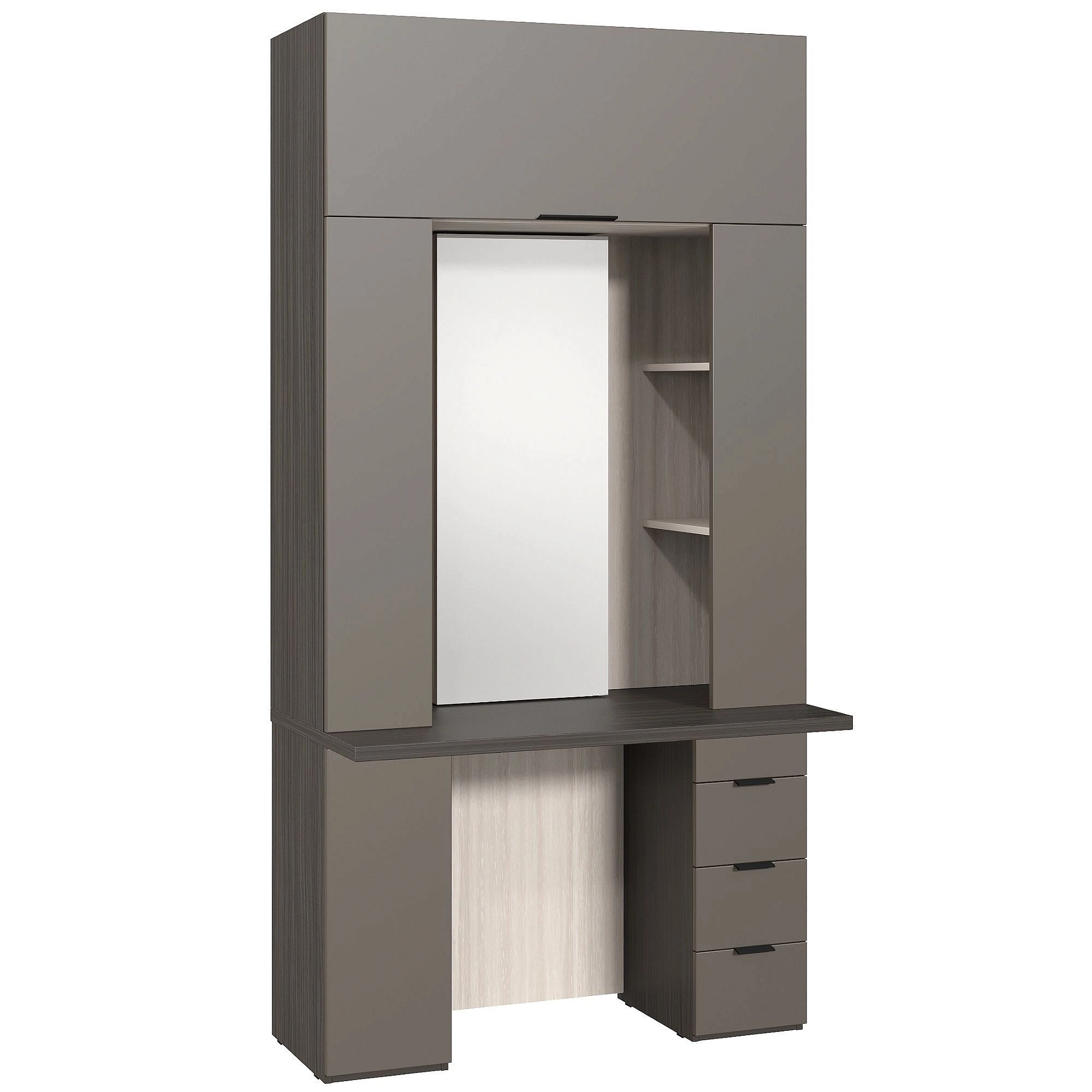 Три ящика. Внутренние детали ящиков – структурированная ЛДСП 12 мм, текстура «Белая», структура «Шагрень» от компании Schattdecor (Германия). Дно ящиков – белое ДВПО. Кромка на видимых торцах – ПВХ. Направляющие – с доводчиками. Петли – с доводчиками. Дверь с зеркалом – петли без доводчиков. Секция комплектуется механизмом открывания Push open. Ручки – 64 и 160 мм, цвет черный матовый.
